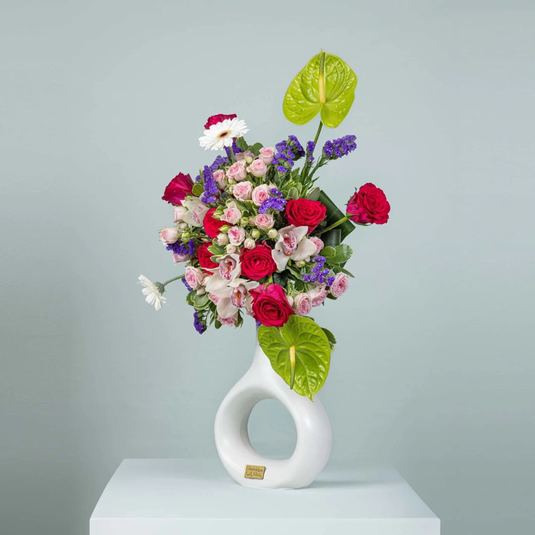 فازة ورد، مزهرية أنيقة ومميزة، مكوّنة من الورد الهولندي الفاخر بتصميم حصري مبهر
