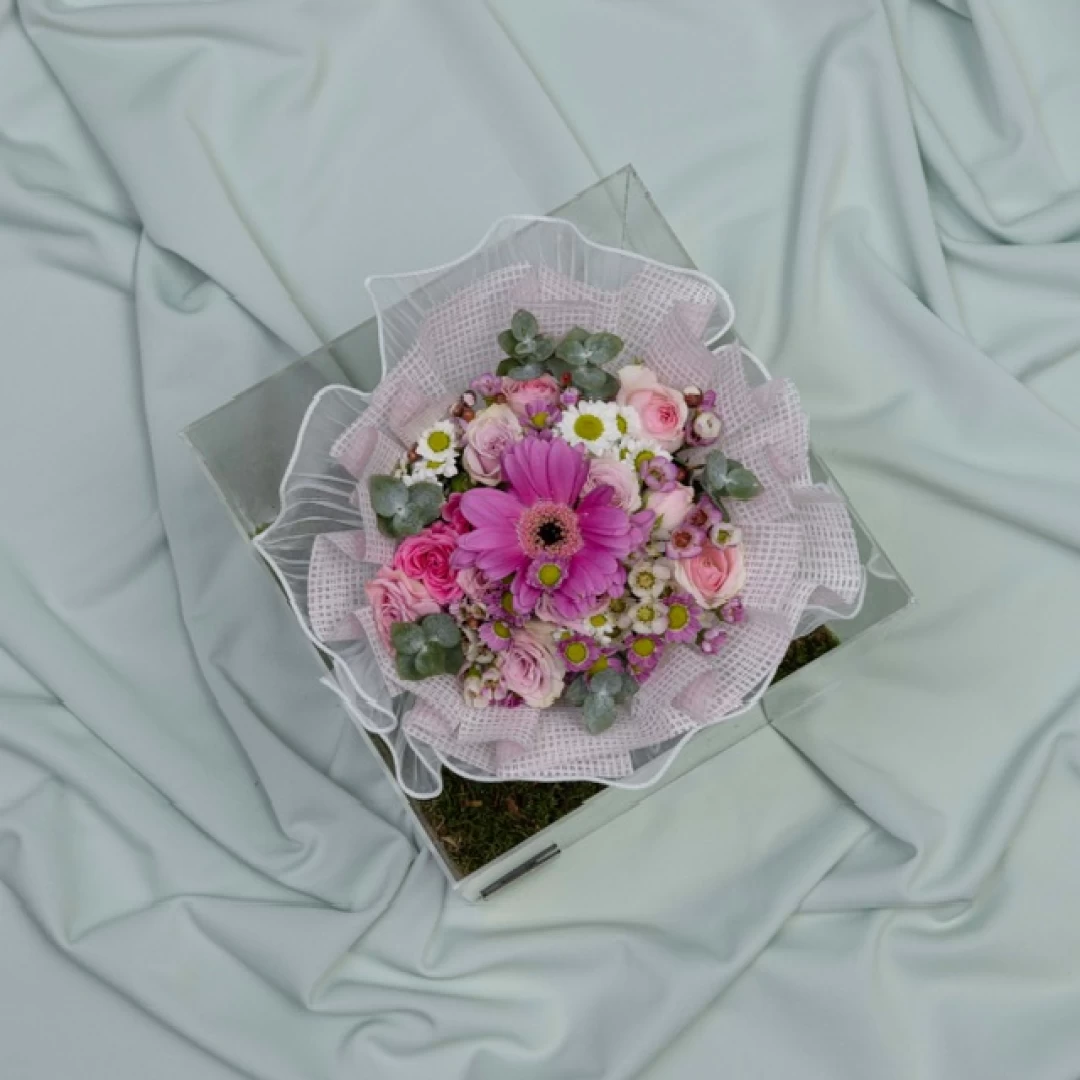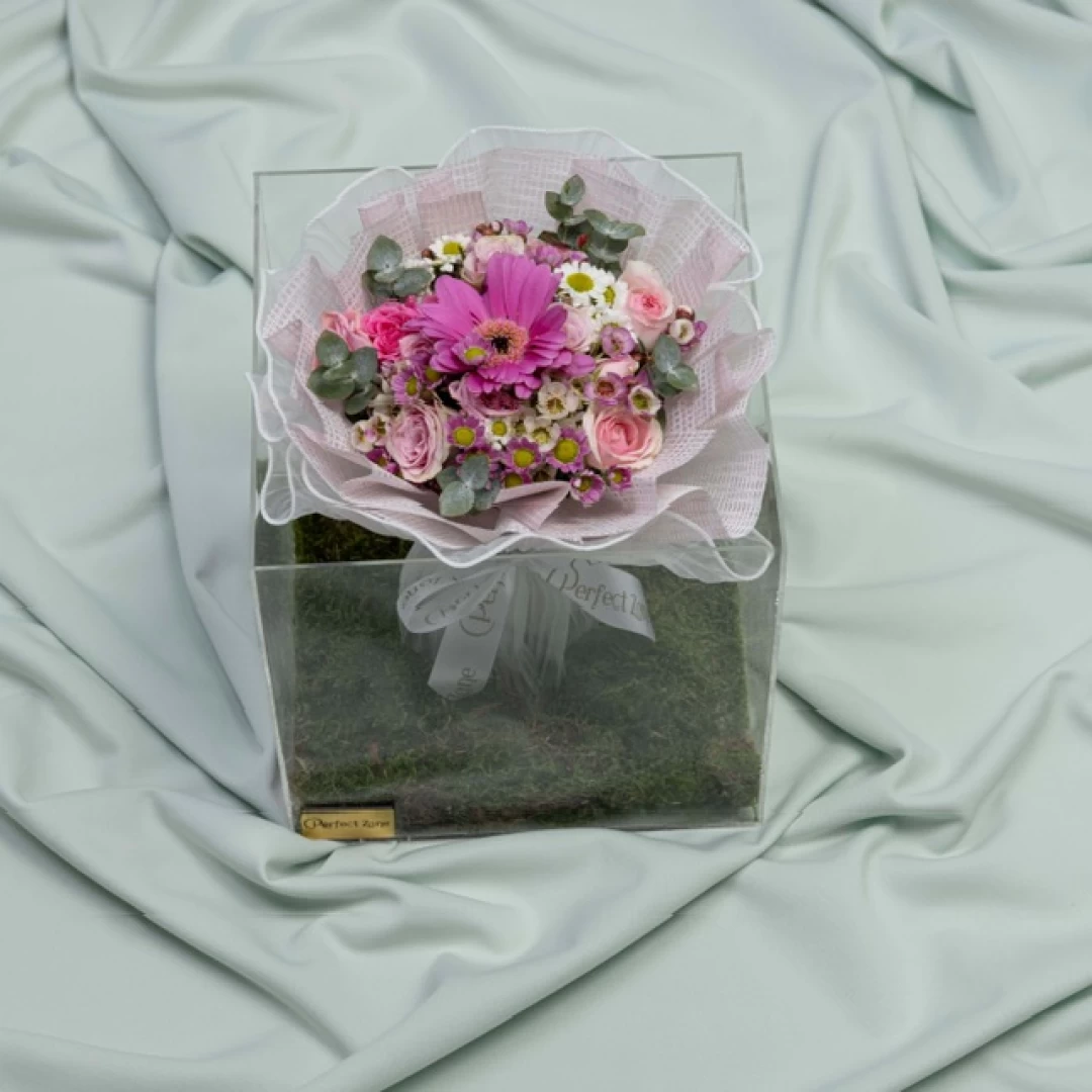 اكريليك مربع ذو حجم متوسط،وباقة ورد ميني مكونه من زهور البيبي روز والجربيرا