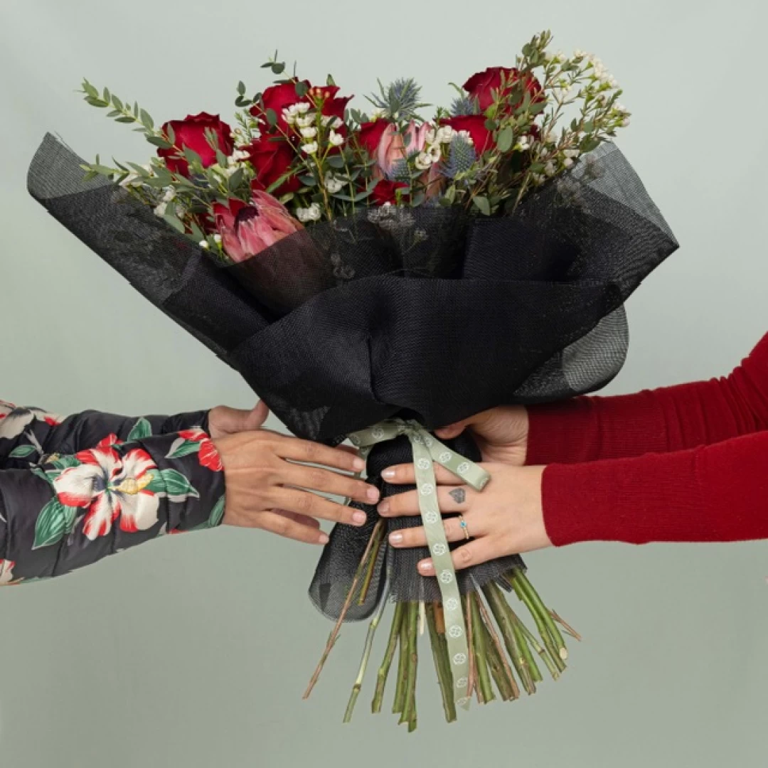 باقة غرام تحتوي على زهور البيبي جوري والجوري الاحمر تشكل مزيجًا مذهلاً وأنيقًا.