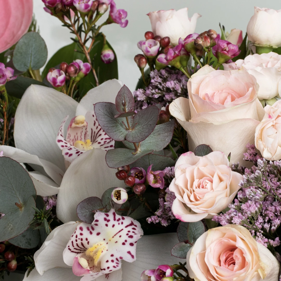فازة تحتوي على زهور البيبي روز و وردة الانتريوم الهولندية