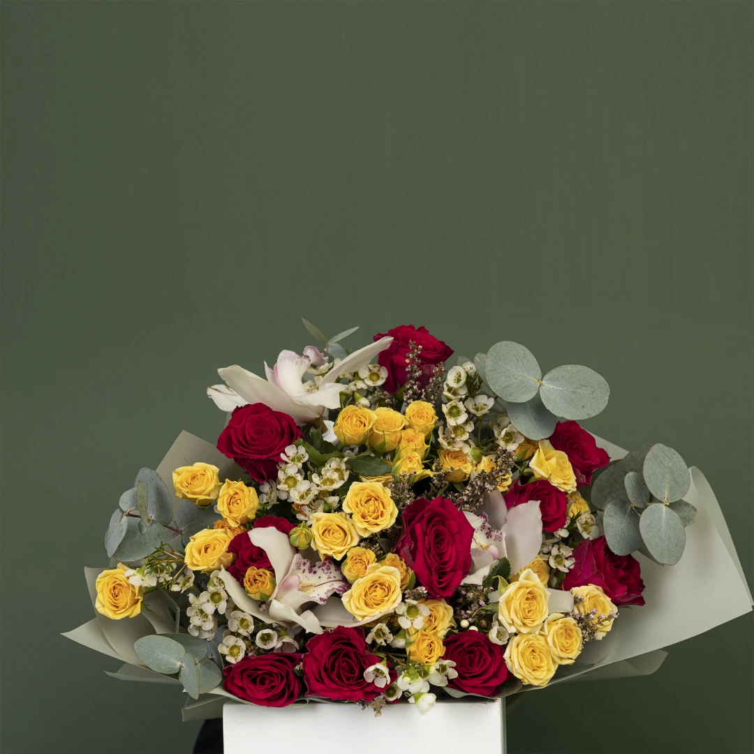 مزيج من الزهور الفاخرة تحتوي على الجوري و بيبي جوري و الاوكس فلور و السمبيدوم