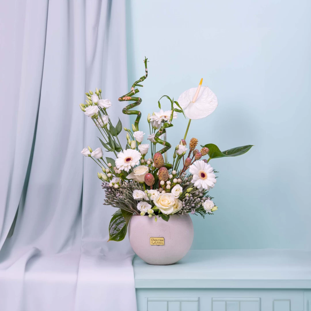 فاجئ شخصًا تحب مع فازة اشراق الورود البيضاء الرقيقة مع الكوبية البيضاء الوفيرة بالزهور الهولندية البيضاء الرقيقة تشكل مزيجًا مذهلاً وأنيقًا.